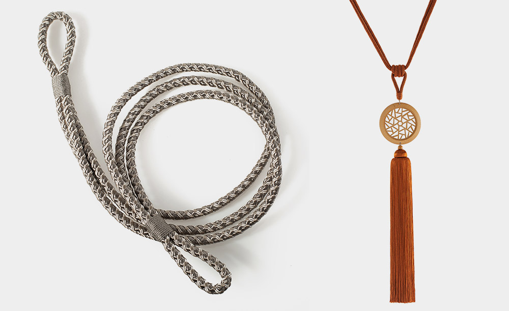 將蠟繩原料制作出仿皮效果后,交織成一根肌理清晰的粗繩,配上亞光的金屬接頭,呈現(xiàn)出硬朗與簡(jiǎn)約。